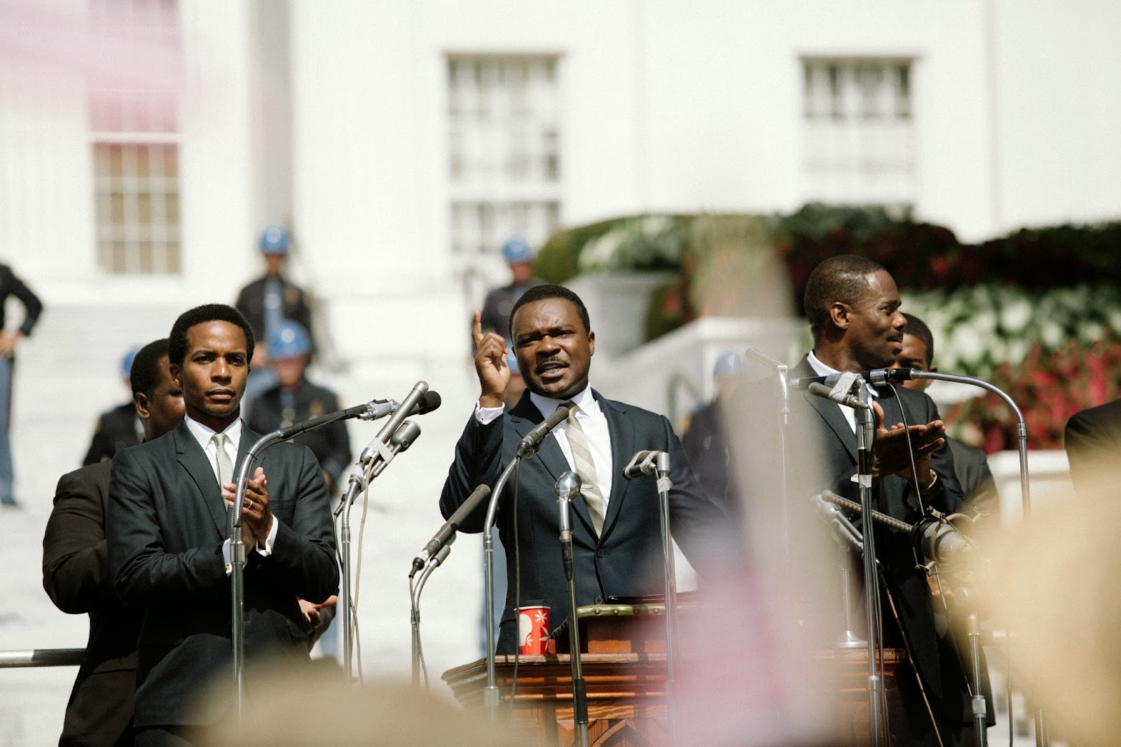The vessel through which the audience views King’s actions is the remarkable David Oyelowo in a commanding performance. With footage and documentation of King being so ubiquitous, managing to be convincing as such a figure is a tall order indeed, and Mr. Oyelowo succeeds with aplomb. Oyelowo and director Ava DuVernay manage to highlight Dr. King’s humanity, treating him not as a saint or as a merely symbolic actor but as the leader of a political organization with concrete goals and tactics to accomplish them. The picture also took care to present him as a multidimensional and flawed human being with personal shortcomings and concerns other than political. Rather than detract from his iconic status as a leader and moral exemplar, I would contend that showing Dr. King as a complex and flawed individual enhances and makes all the more remarkable his abilities as a leader and as a moral exemplar. At the very least, it makes for a more interesting screen character than the simplistic and sanitized characterization some of us are used to.